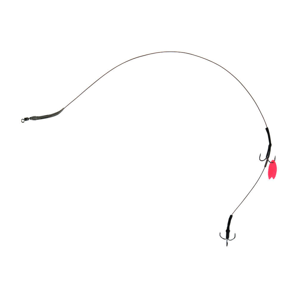 A stinger rig designed to increase hook up ratios and ensure you land more fish. This two treble hook rig is made for dead bait fishing for pike and zander, placing a treble hook towards the head end of the bait with another around the middle to tail end, depending on the bait size. This configuration increases the chances of a fish taking in the hook as well as the bait, regardless of which end the fish attacks from. Each rig is made from a tough, supple, seven strand wire and features two AXIA semi-barbless treble hooks for fish welfare and ease of unhooking. Shrink tubing across each crimp section streamlines the rig, protects the crimp area and helps to prevent tangles. Comes with bait flags to hold baits onto the treble hooks.