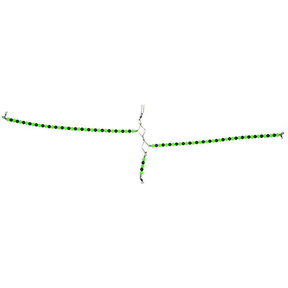 A boat boom that is suited to targeting bottom-dwelling fish. Designed to be used predominantly when drift fishing from a boat, the two booms keep two hook snoods away from each other and fishing in a straight line either side of the weight. The series of green and black beads add visual attraction, which is essential when targeting inquisitive flatfish such as plaice. Two small swivels on either end of the booms are ideal for clipping on hook lengths, giving the angler the option to quickly change snoods as they see fit depending on the situation. These spreaders are fantastic when fishing for plaice, in conjunction with snoods that have been dressed in beads and blades. Spreaders are also useful when targeting smaller species with finer snoods and hooks, such as dragonets.