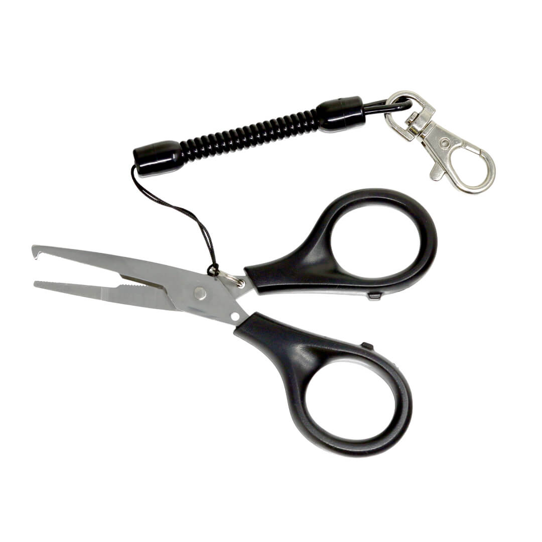 Dual purpose scissors with blades designed to cut braid and monofilament. It also has a split ring plier allowing you to use the scissors to open split rings when attaching hooks to lures. They come with a stretch cord lanyard and clip allowing them to be attached to clothing, bags, vests etc.